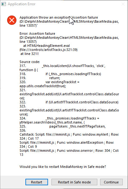 It asserts in Michal's code in artistTracks.js line: existingTracklist.addList(UI.artistTracklist.controlClass.dataSource); because UI.artistTracklist.controlClass.dataSource is not ISongList type. Assigned to Michal to look into it. |