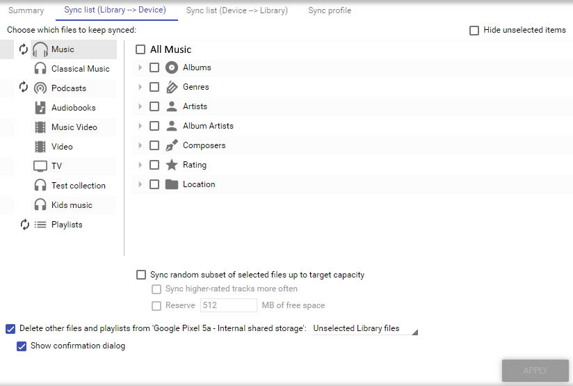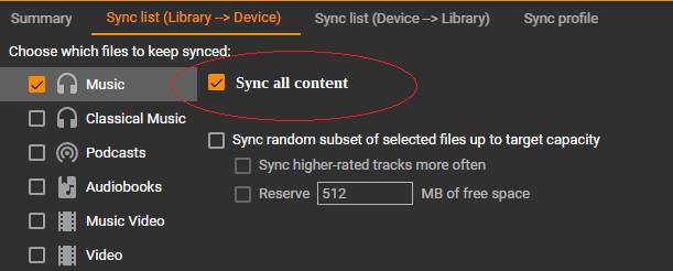 What about introducint '[x] Sync all content' checkbox on the right like this: This new checkbox would just mirror state of the '[x] Music' checkbox on the right and would be shown just when [x] Music is checked (in order to make clearer that all collection content is going to by synced) |