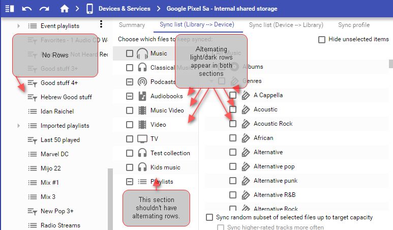 A couple of other issues: A) Deselecting a subnode causes the root rode's checking to go through a long animation. e.g. . 1 Select All Music > Artists . 2 Select All Music . 3 Deselect All Music . 4 Deselect Artists --> Music node repeatedly shows a 'partially selected' animation Note: I would fix this by removing the checkbox functionality from the Collection nodes (and instead just use an icon to indicate inclusion . It's confusing to have two different checkboxes that accomplish the same thing (it's not obvious which should be selected/deselcted). B) The light/dark 'Row indicators' shouldn't appear for the Collections (they should only appear for the 'details') |