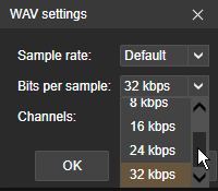 | Description | 1. Audio Bit Depth (Bits Per Sample) is incorrectly labeled eg. It should be 8/16/24 like in other formats not 8 kbps/16 kbps/24 kbps/32 kbps (See attached Image) 2. Higher bitrates are missing, We should at least support some standard HQ bitrates for WAV files (Especially used for DLNA transport of 5.1 ch Audio on devices that do not support FLAC/Other 5.1 capable formats like in proposed solution to use MKA container 0018617) (See attached image of supported formats from other apps) 3. when changing sample rate during conversion to WAV, it fills wrong song length to the file. It seems, it is not regression, the same is for MM4. 0018881:0067117 | ||||