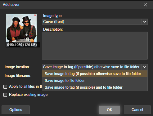 | Description | Add cover dialog should be improved, especially if user Click on Artwork save icon in preview Window i) Image thumb do not have "Show full size". User can't double click/right click on Thumb to see/get full fetched size image ii) Right click on Thumb should contain Lookup Image in order to save user numerous clicks (eg. Cancel -> Right click -> Lookup image -> Ok -> Add cover dialog iii) Image Location contain "Save to tag or to folder", "Safe to folder", "Save to tag and folder" the missing case is "Save to tag (if possible)"/"Only save to tag (if possible)" which will not try to save to folder if save to tag fail. | ||||