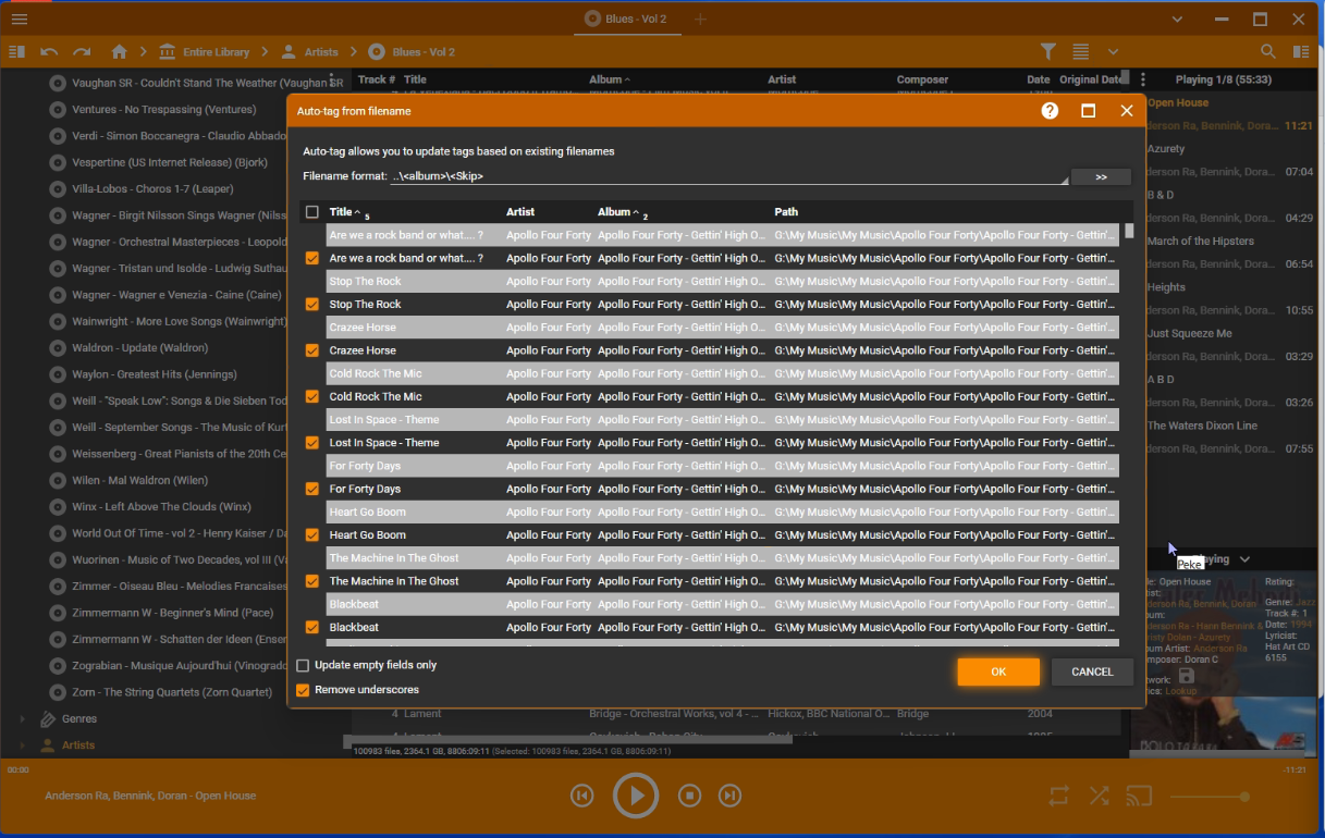 | Description | Using Auto Tag from filename on large number of files and corrections show MM as Frozen after clicking OK. Window Itself Updates quickly on mask change, but clicking on OK make it froze and not releasing Main MM window. In Sample image Accidentally user corrupted Album Info, while he had it in Folder Structure. So we Auto Tagged 100k :) Expected that after clicking ok it goes to background and progress is shown in status bar. NOTE: as user used non debug version we are waiting for either Freeze crash or it finishes tagging so that we reinstall Debug version of 2625. EDIT: Auto Tag from Filename finished OK after 37 minutes of MM main window frozen and everything was correctly tagged. | ||||