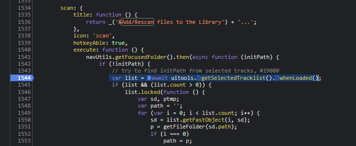 The fix caused a regression (it's regression in SVN Trunk only -- not in 5.0.4 branch): 1) Go to Pinned node 2) Re-start MM5 so that the Pinned content is shown 3) Click menu File > Add/Rescan => nothing happens! Debugging this I found that it stalls on the line 1544, see the screenshot below: |