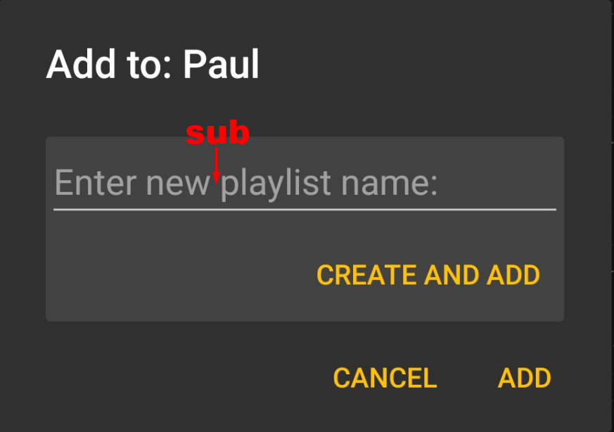 | Description | i) Add to Playlist only allow adding to root playlists not any existing subplaylists ii) Add to Playlist icon is not clear that it will present adding track to new sub playlist iii) Adding track potentially to New Sub Playlist is not clear it should be "Add to playlist: xxxxxx" --------- Enter new sub playlist name: [Create new and add] --------- [Cancel] [Add]" | ||||
