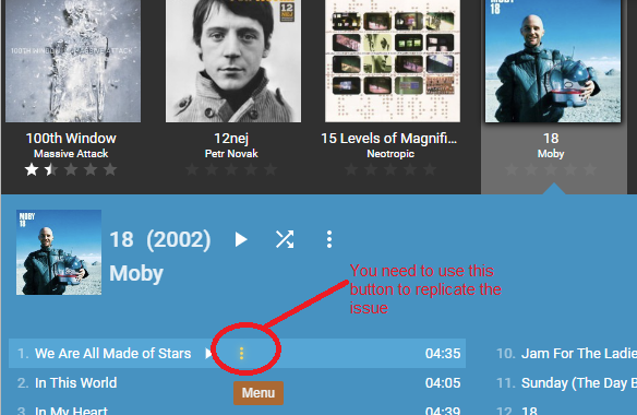 | Description | I had trouble to replicate this (reported by user in ticket # 5099 ) but then I found how to replicate: 1) Go to 'List (by Album)' view 2) Click any album to expand it 3) Click the three dots menu and select Properties => Next/Previous buttons in Properties does not work Note that performing the stem 3) by right-clicking the track and select Properties works fine and does not exhibit the issue This is a recent regression introduced in 5.0.4.2690 (works fine in 5.0.4.2684) | ||||