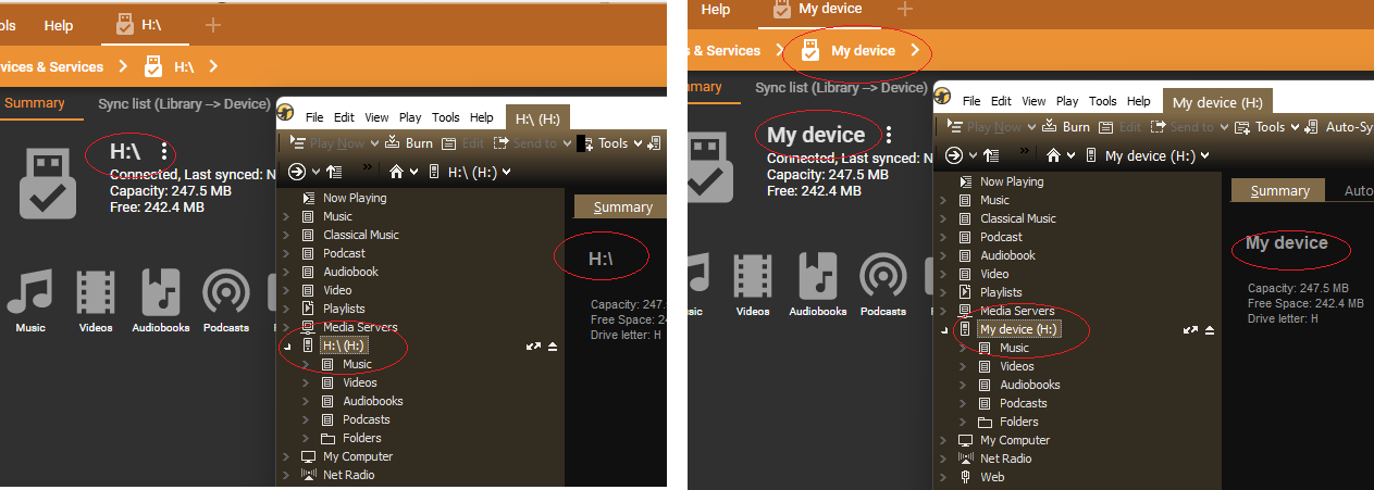 | Description | With plain memory stick (when MM cannot detect the volume label or the label/name is empty) then the name of the profile is just drive letter, e.g. "H:\" , but if the user doesn't label such a device profile and the drive letter changes then it is confusing that device connected as drive 'I:\' is still called 'H:\' Possible solutions: 1) Always show also the drive letter as an appendix like in MM4 media tree, i.e. H:\ (H:\) -- see screenshots below or 2) When the default name is 'H:\' and drive letter has changed to 'I:\' then auto-rename the device to 'I:\' | ||||