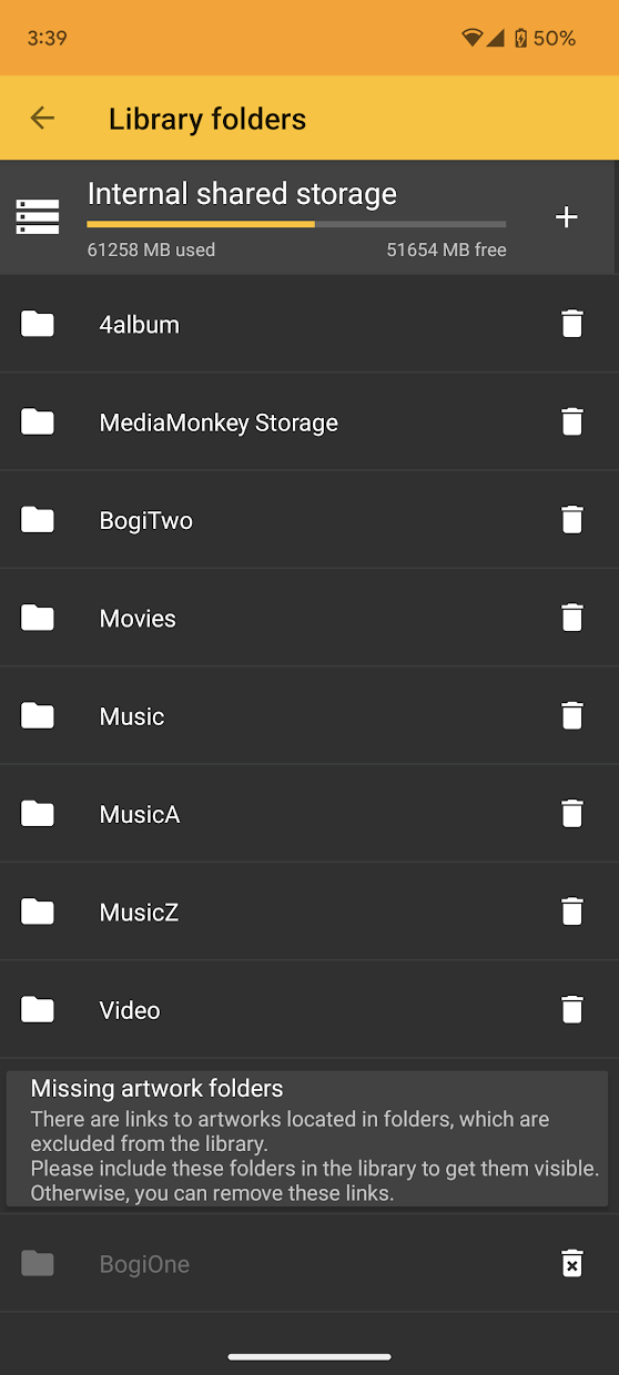 To clarify: Pre Android 1<= 10 (API 29) Android Media store saves album art as filepath, but on newer Androids bitmap must be loaded directly via media store API(no filepath available). This applies to media synced from the Android media store. For tracks synced with MMW/5, the artwork is still stored as a filepath. If access permission to folders is missing then such artwork is not visible until permission is granted. I believe that if 'External storage' permission is disabled, then the artwork file looks like deleted(missing). It will cause such artwork to be cleared from our database. Cleared artworks can be updated via WifiSync or via MMA artworkRepairTask. The artwork can reappear due to MMA artwork repair task or resync with MM5. 1)WifiSync updates media by new filepath artwork 2)"MMA artwork repair task" will update media to load artwork via the MediaStore API. This loading method is successful if the artwork file is located in the same folder or is stored in Tag. Artwork for tracks without Albums was never supported on MMA side. Maybe we could change this in the near future, but it would be a completely new feature(e.g. only for > API 29 to be loaded via MediaStore API). |