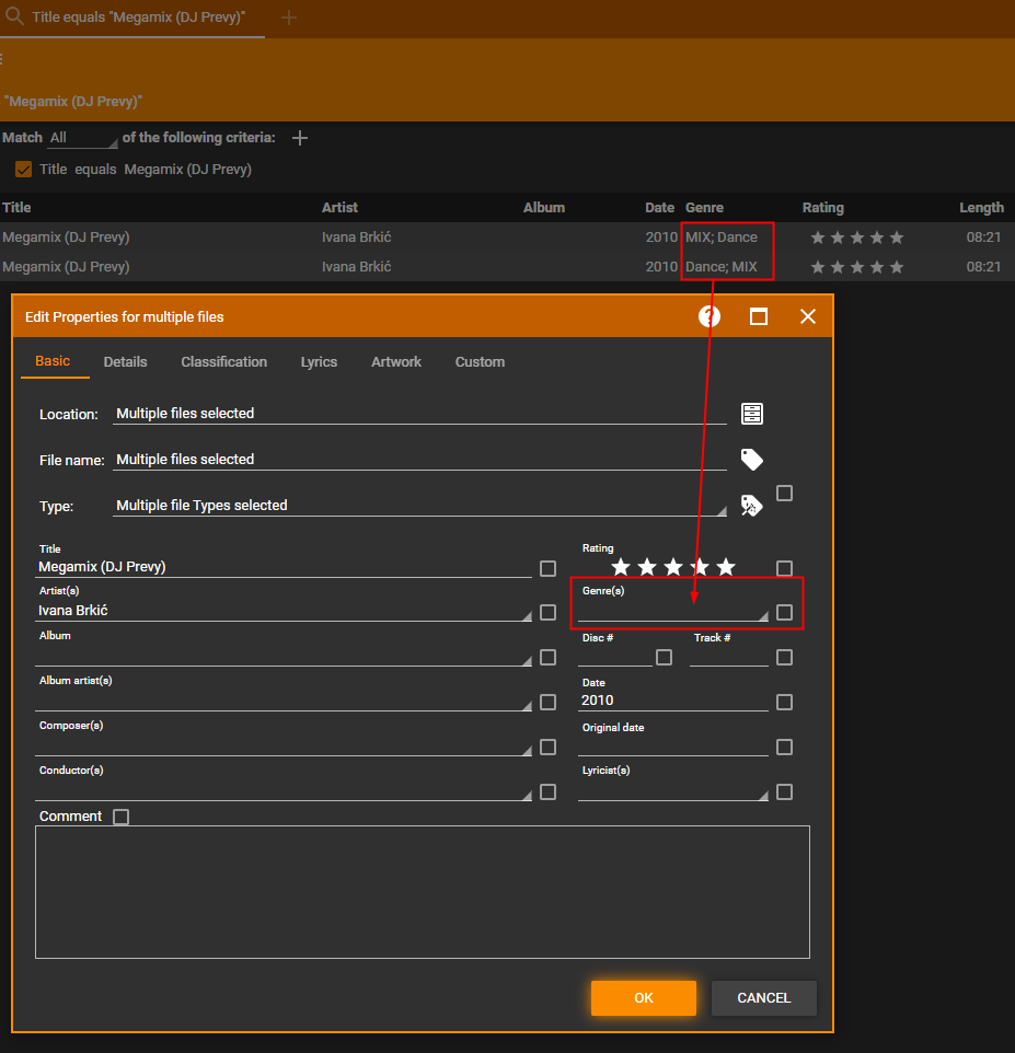 | Description | Multi Value edit fail if order of Values are different. eg. one track have genre "Dance; MIX" and other track have "MIX; Dance" and you want to edit both tracks Genre is empty, where it should contain same value. Same goes for other Fields that support Multi Value. | ||||