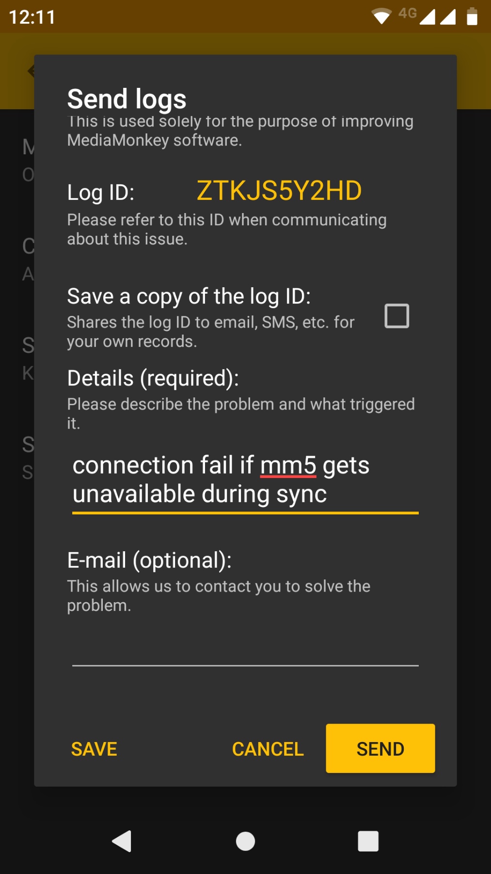 | Description | Sync Fail from Unknown reason even Server is Available to device. 1. Start Sync 2. Start to Terminate sync 4. Restart MM5 -> Sync canceled 3. Start sync again 4. Fail 5. repeat steps 3, 4 10 times to be sure 6. Scan QR code from MM5 server 7. Server available. | ||||