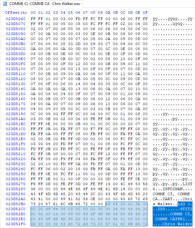 | Description | Some WAV files with incorrect ID3 Chunk are not playable in MM. Sample files are supplied in Support Ticket namely: - 'COMME CI, COMME CA Chris Walker.wav' - 'COMME CI, COMME CA Frank Chacksfield.wav' Audio Data is intact, and RAW Brute Force delete of "id3" chunk from end of file make MM normally read LISTINFO tags. NOTE: RIFF Track size from header needs to be recalculated afterwards. | ||||