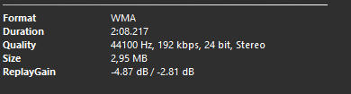 | Description | WMA Codec encoding do not work in MM5 User sent us sample files at https://www.mediamonkey.com/forum/viewtopic.php?p=510900#p510900 where original file is detected as 44.1/16Bit Stereo CBR 320 and new copy was 112 CBR Stereo (non selectable option) Try to Convert original File on Win 10 22H2 (Full updates) results are: - MM4 fail to convert and play file correctly unless conversion is set to VBR 90%+ and 48khz - MM5 (2338-2807 all stable and latest beta) fail to convert and play file correctly (File always ends being 440Kb) NOTE: In MM4 Setting VBR 90%+ and 48khz ends file format in 192kbps 48/24Bit TEST NOTE: Decoding/Converting of WMA files is not affected only Encoding is buggy ATM across all Available Windows MM versions and appears Windows 10 22H2 (mine) and Windows 11 (Users) | ||||