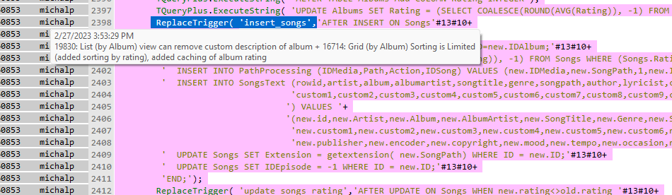 Particularly this part of the DB trigger: ' UPDATE Albums SET Rating = (SELECT COALESCE(ROUND(AVG(Rating)), -1) FROM Songs WHERE (Songs.Rating>=0) AND Albums.ID=new.IDAlbum); |