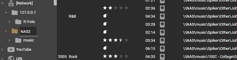 For the UNC > UNC mapping SQL like this should work: UPDATE Songs SET SongPath = REPLACE(SongPath, '\\NAS1', '\\NAS2') WHERE SongPath LIKE '\\NAS1%' ..but then upon trying to expand Location node MM5 is doing some further massive SQL procesing related to the SongPath change (from the new SongPath it needs to re-construct also the folders hierarchy in further tables like Folders and FoldersHier) so unfortunatelly it is not an easy task to mass update SongPath.. To make it an easy task we would need to get the \\NAS1\ prefix out of the Songs.SongPath (to the Medias table) and this would be part of 5.1 => 5.2 DB upgrade |