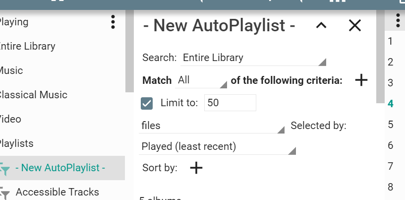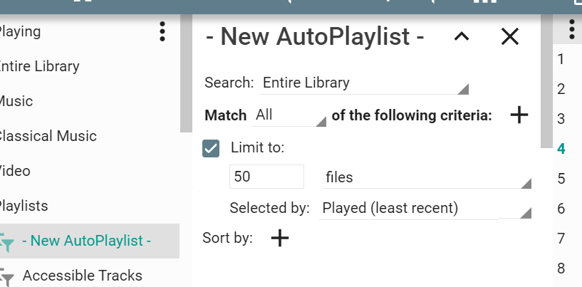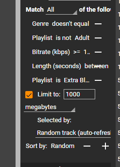 If the tracklist is very narrow and the files/MBs/mins dropdown flows into the second row, it should be aligned to the "Limit to" text. Actually, all controls that are related to the Limit check box should be indented and aligned to the "Limit to" text. There is another issue when the tracklist is very narrow, the plus icon button next to the "of the following criteria" is not visible. Maybe it could flow into the next row together with that text, but I suppose it would be too complicated to get with such narrow window since many other controls wouldn't be visible in such case. |
