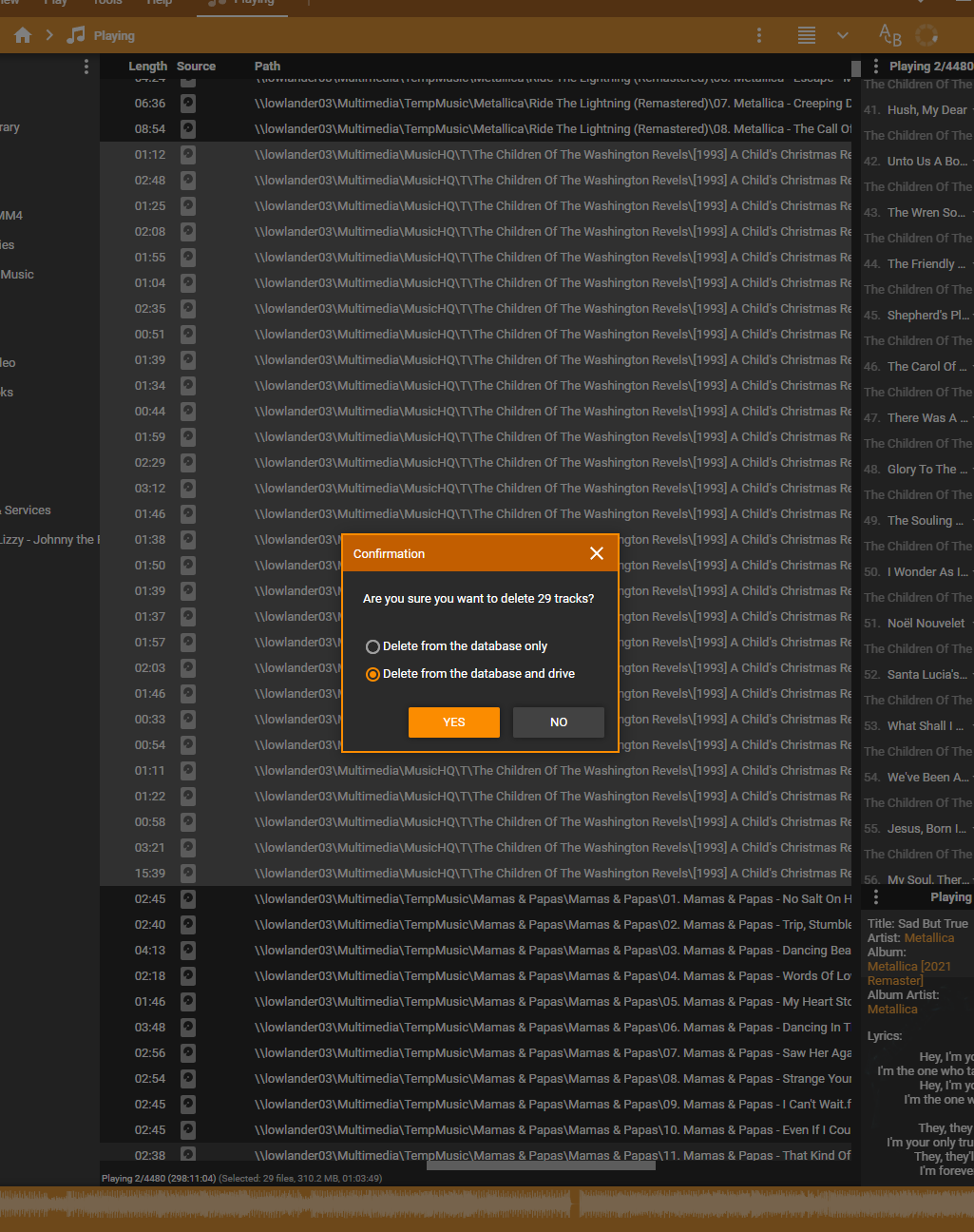 | Steps To Reproduce | 1 Working in the Playing node, Confirm desired options on removal from 'Playing' list is disabled in Confirmations. 2 (maybe) Rate some files 3 Select multiple Albums (it doesn't seem to trigger on single Album) 4 Hit Delete key --> Expect files to be removed from Playing, instead the option to delete from Library or Library and PC is shown | ||||
