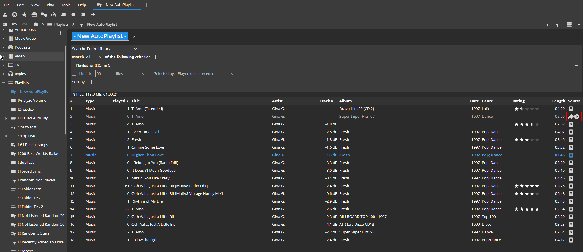 I can confirm 1. Created !!!!Gina G. Auto Playlist contain Artist contains Gina G., Music collection -> 17 Tracks 2. Created "- New Auto Playlist -" contain Playlists = !!!!Gina G., Entire library -> 18 Tracks (18th track is Audio CD And from entire Library not From Music collection) |