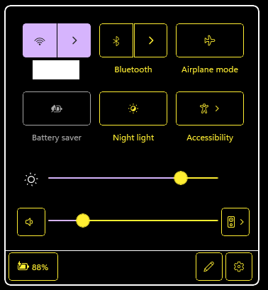 The thing is that I have a skin which treats toggle buttons differently than menu buttons, and this single button messes with my concept. This is particularly problematic since my skin works with Windows contrast themes that have reduced set of colors and similar design elements that are available with non-contrast themes. By the way, here are the screenshots how the similar buttons with connectivity look in the Windows tray popup: the left part of buttons is a toggle button and the right part allows choosing a connection. The icon on the right part is a right arrow, instead of a down arrow that is recommended for ToggleSplitButton control, because click on it doesn't show a dropdown menu, but it switches to another page. |