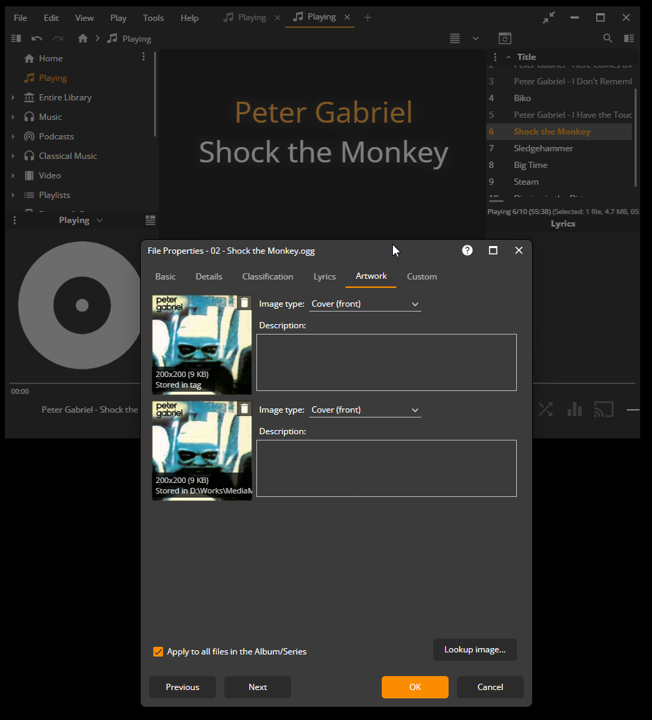 | Description | This is random and quite irritating. It happens with Preview panel and/or mini player. Sometimes one is displayed correctly, but not another. It happens with playing tracks and selected tracks. There is also the Artwork: Lookup info row in Preview if Advanced layout is chosen. However, the track has artwork already stored in tag and it also has Folder.jpg in the same folder. When I open Properties dialog box, it can be seen on the Artwork page just fine. This happens for files already stored to the Library and for files in Folders that are not added. I tried clearing completely the Thumbs folder form the Portable folder, restarting program multiple times, without help. Then I opened again the Properties dialog, turned off and on the "Apply to all files in the Album/Series" option, confirmed on OK and then there it appears! Why the artwork should be assigned to all files from the same album to be seen? What if I don't want that other files are affected? Isn't enough if it is already stored in tag to be displayed? Not to mention that it has also Folder.jpg in the same folder. | ||||