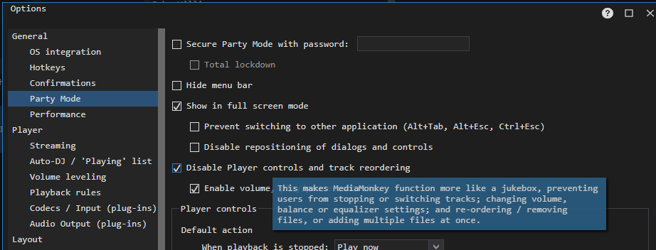 | Description | Play Now/Play Next/Play Shuffled options all remain available during Party Mode. There are scenarios where you'd want to limit it to just Play Last during Party Mode. 1) In the Party Mode options there should be checkboxes for each Context Menu/Main Menu Play option allow the user to select what's available during Party Mode. This way you could limit it to just Play Last, or just disable Play Now (avoiding interrupting currently playing file. 2) Additionally maybe there should be an option to disable multi-select as a separate option. To prevent users from selecting large amounts of files to be added. This option should disable multi-select altogether in the Filelisting/'Playing' list. a) Add option to disable multi-select, or b) Add option to limit multi-select to X files | ||||