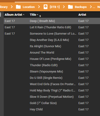 The three tracks have Album Artist = 'East 17' while remaining 15 tracks have Album Artist empty, so it is correctly tracked as different ablum: |