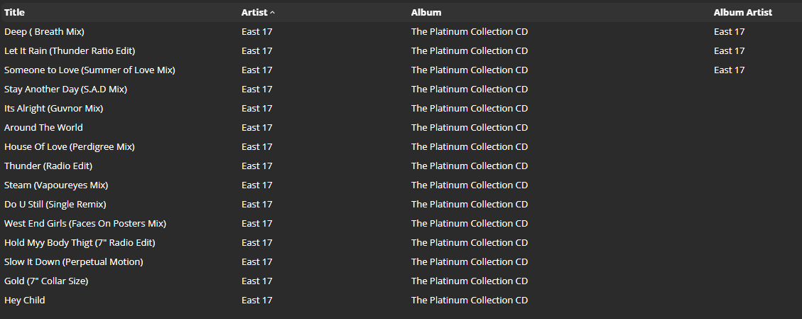 ok, so in 0016388 b) Rusty saw a major issue when 1 track has 'album artist' and others tracks have empty 'album artist' that pre-checking the value in mass edits can accidentally cause for all tracks to get non-empty 'album artist', this was fixed and I agree with Rusty that current behaviour is expected and that pre-checking the value does not communicate the problem at all What the best communicates the problem is to enable 'Album Artist' column in filelisting: Seeing that current default columns for music collection are: 'title', 'artist', 'album', 'date', 'genre', 'rating', 'length', 'source', 'path', 'filename' so we could either change them to 'title', 'album', 'albumartist', 'date', 'genre', 'rating', 'length', 'source', 'path', 'filename' or 'title', 'album', 'artist', 'albumartist', 'date', 'genre', 'rating', 'length', 'source', 'path', 'filename' ?? |