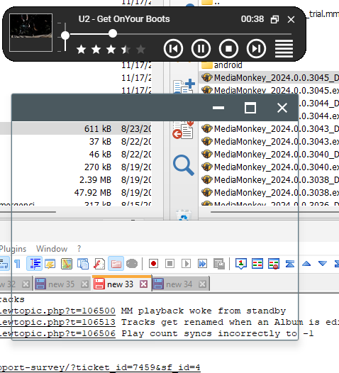 Tested 3044 and this still isn't fixed. There are 2 issues: 1) The original issue (when video plays, both the miniplayer and the video window are overwritten by other apps) 2) Clicking NEXT after the Video results in the miniplayer disappearing upon clicking another app (this is another variation of 0021108) Repro Steps: 1 Create a playlist Track 1 - Audio Track 2 - Video Track 3 - Audio 2 Initiate playback of the playlist when MM is running in a regular window 3 Minimize to MiniPlayer 4 Tap on a Window that's behind the MiniPlayer (but larger than the miniplayer) --> MiniPlayer remains on top, as expected 5 Click NEXT --> Video starts playing 6 Tap on a Window that's behind the MiniPlayer/Video (that's larger than the miniplayer) --> MiniPlayer/Video appear behind the Window! (issue 1) 7 Click on the MediaMonkey Taskbar icon --> MM appears on top (but not permanently on top--i.e. issue 1 can still occur at this point) 8 Click Next --> Audio track starts playing 9 Tap on a Window that's behind the MiniPlayer (that's larger than the miniplayer) --> MiniPlayer disappears and MediaMonkey disappears from the Taskbar --> The only way to get MediaMonkey to re-appear is by right-clicking 'Restore' on the tray icon |