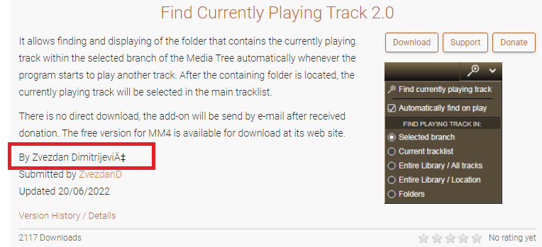The problem is on server side: https://www.mediamonkey.com/_con/addons/apibrowse.php "Zvezdan Dimitrijevi\u00c4\u2021" is correctly unescaped to "Zvezdan Dimitrijević" Tried with https://www.freeformatter.com/json-escape.html#before-output It is also incorrectly shown directly on the website: https://www.mediamonkey.com/addons/browse/item/find-currently-playing-track/ |