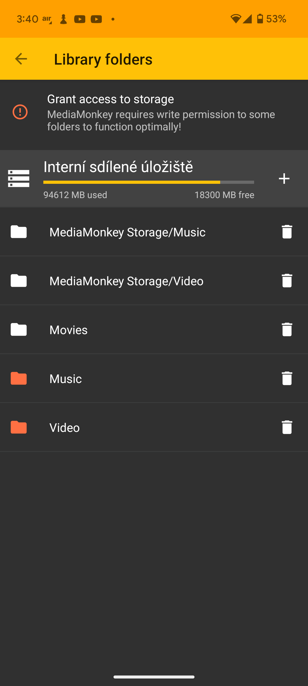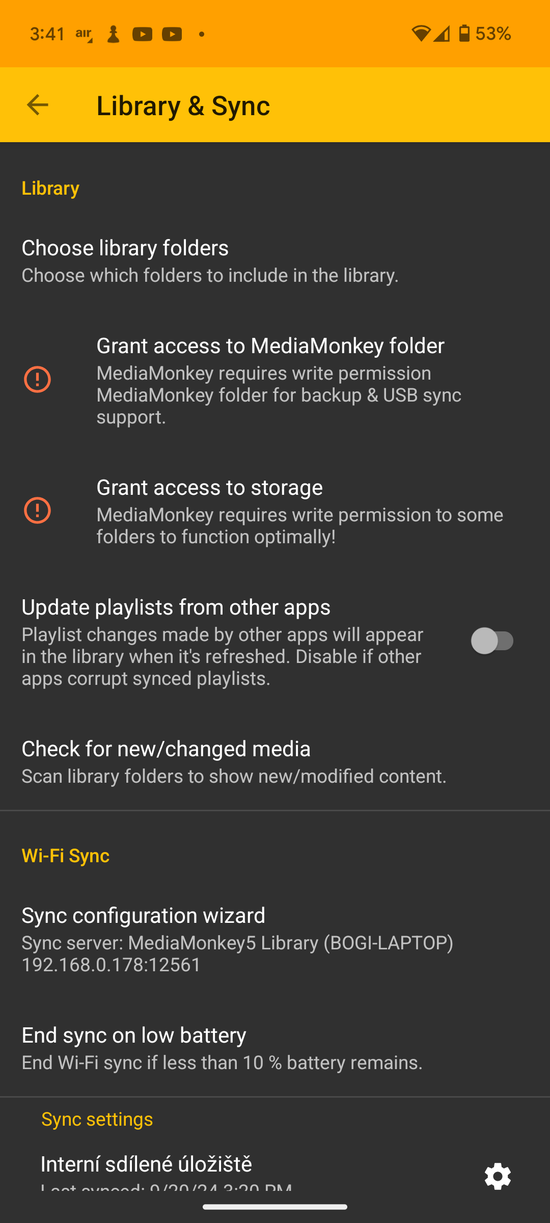 i) The user is asked again before the first launch of wifi sync (or after the second step in the sync wizard). The folders in the Access dialog are updated by folders specified in MM5 and yes it would be nice to inform the user on the MM5 side. If the user uses the skip button then he is never asked again until some change happens(new storage, new setting in MM5). ii) A) highlight 1) At "Library folders" it's not a problem. We can change it to a warning color and we can also highlight folders. 2) At "Library and Sync" there is an issue. This is the preference screen so there are required only preference items. We can specify a custom layout for the option, but the general layout has slight differences depending on the Android version. I will verify the possibilities. B) text I believe the description should be shared between the option in "Library and Sync" and "Library scan", so there should not be "these folders", I suggest: MediaMonkey requires write permission to some folders to function optimally!' |