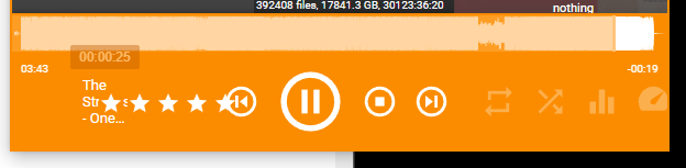 1 Going the smallest width MediaMonkey allowed on 3054, I see Ratings overlapping file info and Previous. 2 Buttons disappear off screen with all of them enabled. 1 is a real problem, 2 less so. Could a solution be that below a certain width all player elements are shrunk so they fit the window width. How much shrinking would depend on what's enabled to be shown. |
