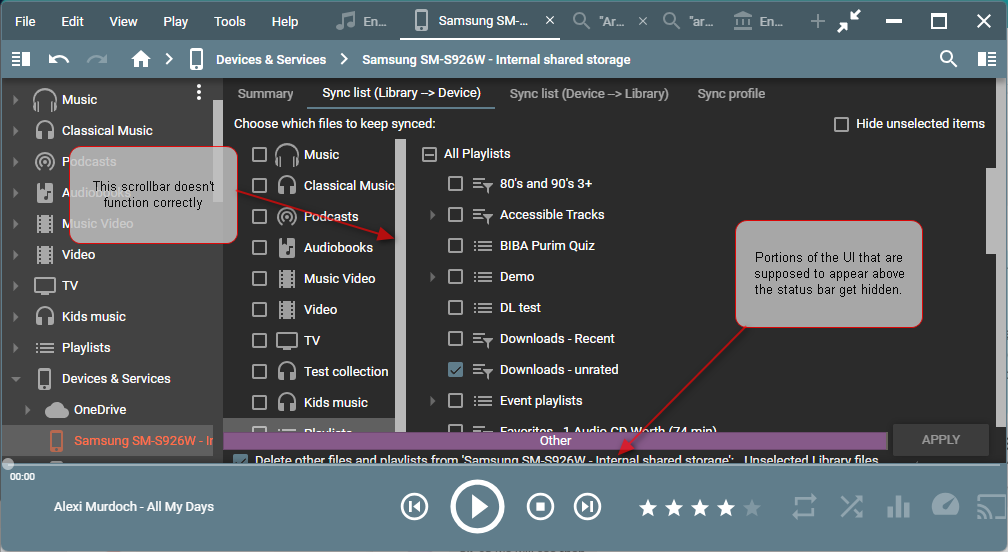 | Description | If the user navigates to Devices & Services > DeviceName and shrinks the dialog to < 288px in height, then the sync status bar / [Apply] button overwrites portions of the dialog ('Delete other files and playlists' and 'Show confirmation dialog'). Moreover, as the dialog shrinks, the scrollbar for the tree doesn't function. What should happen is that the entire bottom portion of the dialog (consisting of 'Delete other files and playlists' and 'Show confirmation dialog', the status bar, and the Apply/Sync buttons) should move as a single unit, and the scroll bar for the tree items should get activated and function once the tree can't display in its entirety. | ||||