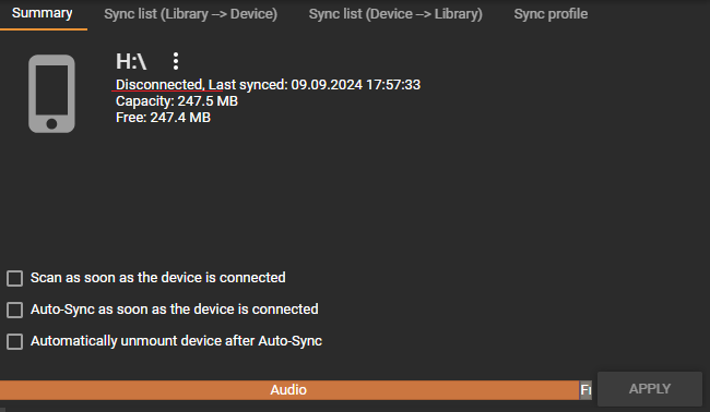 Verified the UI fix in 3054. I noticed that you eliminated the storage indicator from devices that aren't connected (and therefore have an unknown amount of total remaining space). Wouldn't it still be useful to show, for such devices either: - The amount of space that is expected to be free based on the total amount of space available from when last connected? - The amount of space the is expected to be used based on the selected items in the sync list (combined with the auto-conversion settings)? |