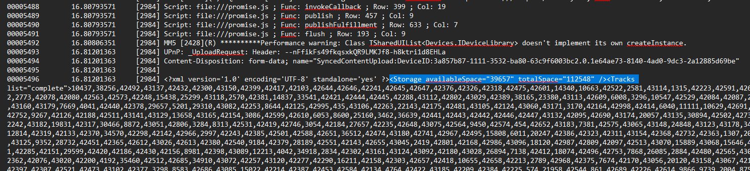 Assigned to Martin to add the necessary info on MMA side.. i.e. MMW needs info about capacity and free space.. e.g. in 'SettingsUpload' XML elements like: <capacity>17179869184</capacity> <freeSpace>5067769184</freeSpace> |