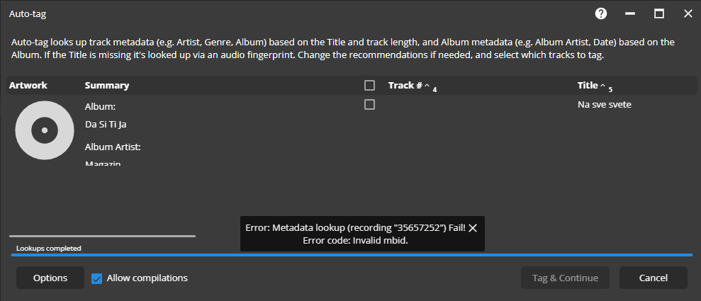 | Description | Auto-Tag MBID Fail on some tracks with tooltip Some users find that annoying as it looks like MM issue not MB and not verbose why it fail. Sample track is on FTP | ||||