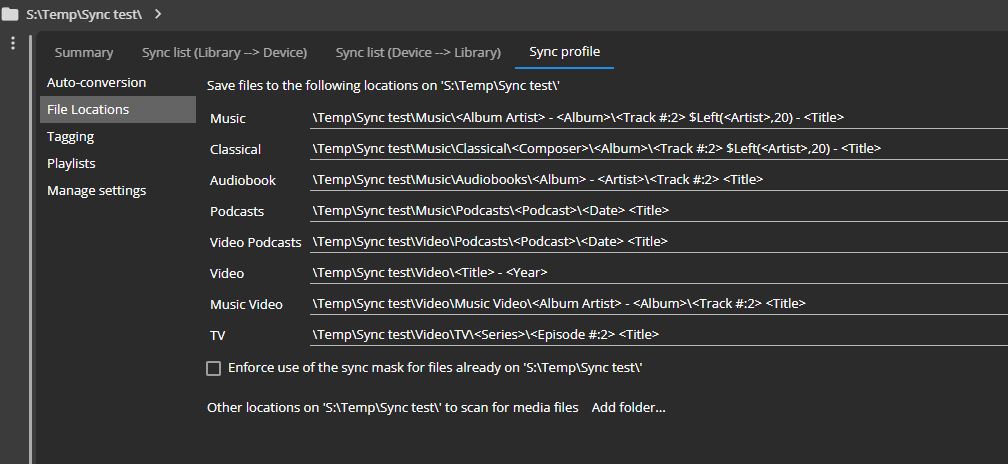 Re 1) Profile is created based on absolute paths including Path to folder, but Without Drive letter where every other Sync profile reflect to Absolute path and appending Device/Service Root path as suffix to Mask, but Sync to Path only watch mask not Root path. eg if Root path c:\Temp the any changes to Mask should be c:\temp\ + DECODED MASK ("s:\Temp\Sync test\" + "\Music\<Album Artist> - <Album>\<Track #:2> $Left(<Artist>,20) - <Title>" not Drive letter of ROOT path + DECODED MASK ("s:\Music\<Album Artist> - <Album>\<Track #:2> $Left(<Artist>,20) - <Title>" Re 2) It only happens with Set Sync Path. And it is design ISSUE, User contacted me that Syncing to Folder deleted whole library on External Drive as he copied Phone Mask to folder Sync (similar to my example). |