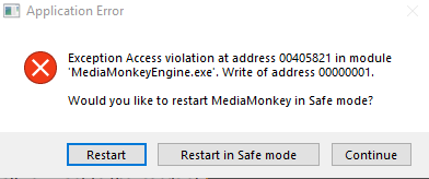 | Description | Just observed AV in address 00405821, MediaMonkey was ripping a CD and tagging an Audiobook while this happened. | ||||