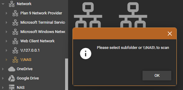 I think it is fine without a feedback and just not adding it to the scan list, because: 1) It was always like this also for nodes like 'Microsoft WIndows Network' without a complaint 2) User can still select the folders directly from the Add/Rescan dialog -> [ADD LOCATION >>] -> Network where the selectable folders have _checkboxes_ In case of any complaints/confusion we can add a message in version 2026, i.e. feel free to add as separated issue.. |