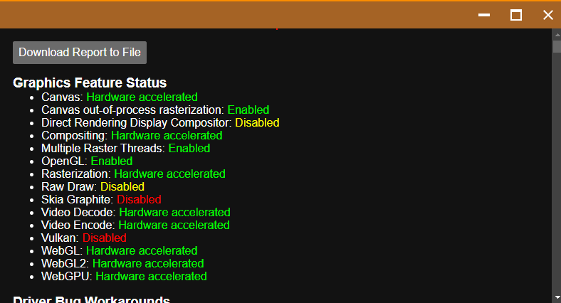 | Description | GPU Info report from Help -> Debug -> GPU info can't be downloaded as Download Report file do not work. | ||||