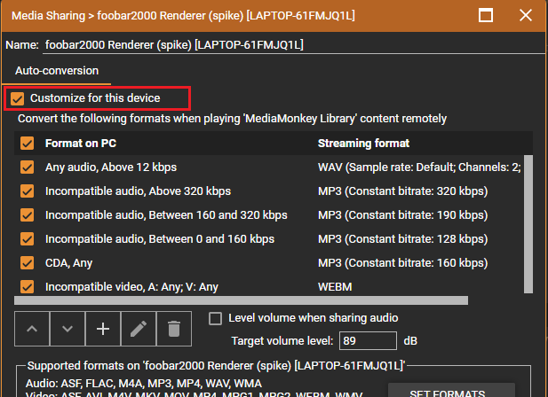 | Description | When using the gear icon next to the DLNA device in the Cast menu it will show the Auto-Conversion rules greyed out. When using this method the 'Customize for this device' checkbox is missing. It works fine if approaching this through Media Sharing settings. | ||||