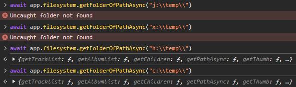 | Steps To Reproduce | You could try it in Console: await app.filesystem.getFolderOfPathAsync("x:\\") | ||||