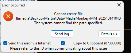 3169 crashes when doing a backup to a full destination, Copy/Paste becomes disabled and AV log can't be send. Log added. 3169 also crashes when doing backup to a non-existent location. In this case I just appended /Test to the normally used Path (and without it backup works). The Test folder doesn't exist. Note that this issue prevents MediaMonkey from starting if auto-backup is selected. |