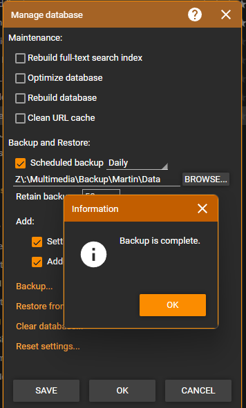OK, the question is what should happen in such a case.. By default there is Retain backups: [3] and currently the old backups are deleted only once the new backup is created.. We could solve it by deleting all but one backup despite the value configured, or (better case) add a warning --> which would require new strings to translate, so probably something for 2026 ? In either case whenever there isn't enough space to make a single backup then a message is needed anyhow, something like: There isn't enough space to backup database/settings, please clear space in the backup location: C:\... [OK] Assigned to Rusty for review.. |