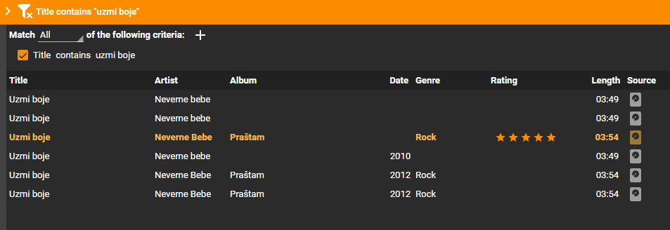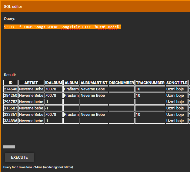 | Description | Advanced search execute non needed queries and shows in progress (Albums/conductor/Artist/...) Instead of for simple search build simplest query Advanced Search -> Title -> Contains -> 'Uzmi boje' -> ENTER -> 9s -> till refresh and 15s to full query is done (image 1). Same query using SQL Editor Addon -> SELECT * FROM Songs WHERE SongTitle LIKE '%Uzmi Boje%' -> EXECUTE and within less than 1s results are shown (image 2) and are same as Advanced query that take 15s+ to show or refresh Video and full MM log is on FTP | ||||