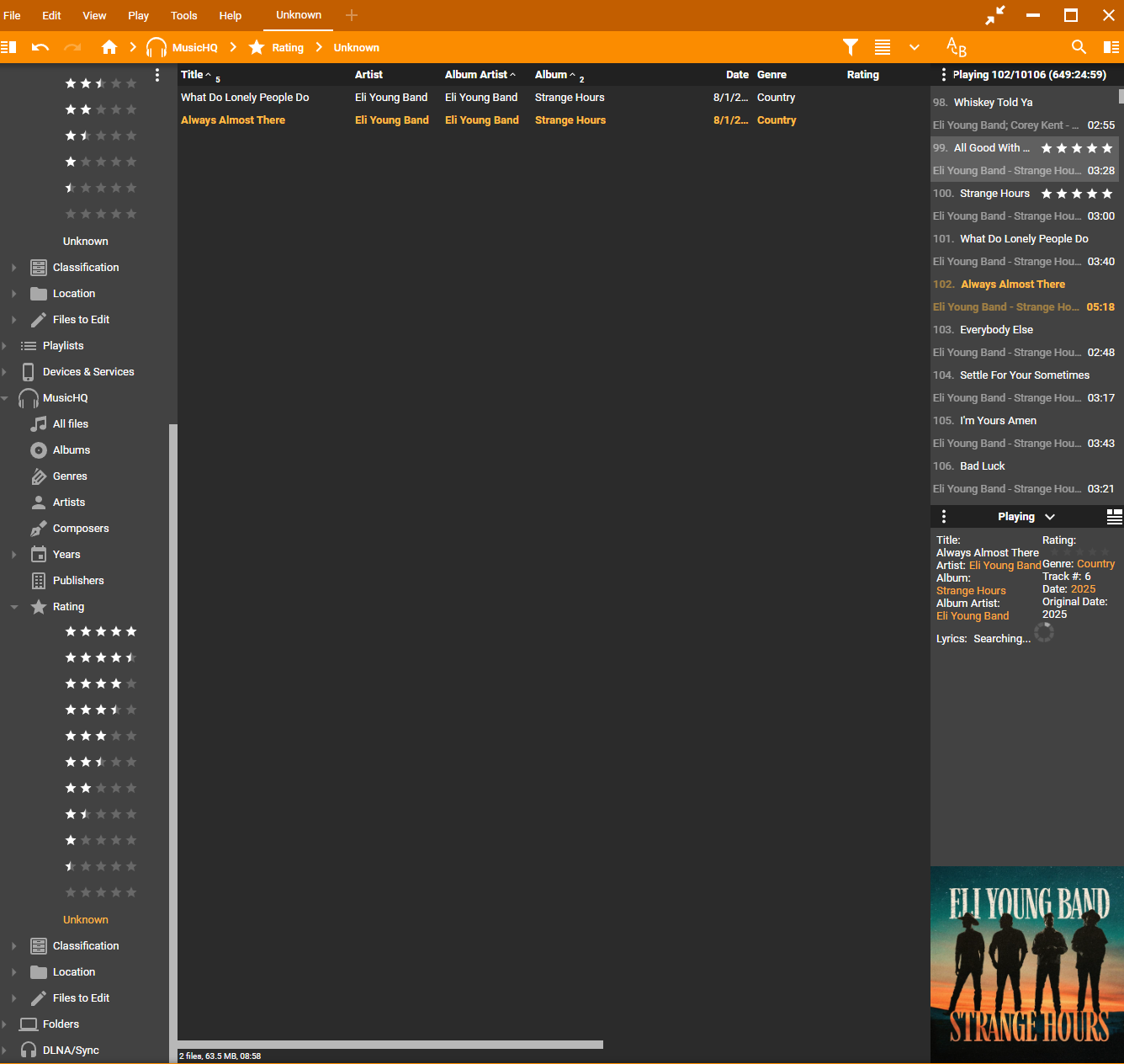 | Steps To Reproduce | 1 What Do Lonely People Do was added somewhere during playback, presumably (but unconfirmed) when Play History update was triggered 2 Other files added on playback start 3 Tagging Rating for these files removes them from View (so they seem to be added to a matching value) 4 Tagging a file in Playing with half star Rating adds it to the half rating node (so playback isn't the trigger, tagging is) 5 Only Rating seems affected, couldn't reproduce with Artist or Genre | ||||