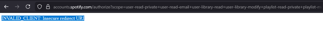 | Steps To Reproduce | 1 Add Service > Spotify 2 Login --> Receive error: INVALID_CLIENT: Insecure redirect URI | ||||