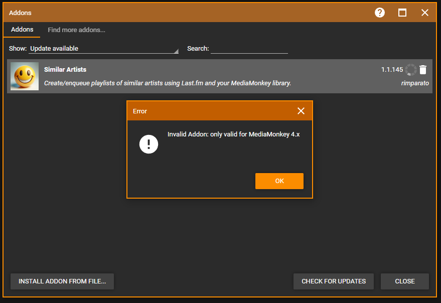 | Steps To Reproduce | 1. Install version 1.1.145 from https://github.com/remo-imparato/SimilarArtistsMM5/releases 2. Restart MM 3. Go to Tools -> Addons -> User Installed -> Check For Updates 4. Click Download update 5. Fail Addon is for MM 4.x Update Link is https://raw.githubusercontent.com/remo-imparato/SimilarArtistsMM5/updates/update.json that points DL to https://github.com/remo-imparato/SimilarArtistsMM5/releases/download/v1.1.146/SimilarArtists-1.1.146.mmip and manually installing downloaded MMIP from that link works. NOTE: Check Updates still uses Update URL from third party site https://www.mediamonkey.com/addons/download.php?id=SimilarArtists Downloads completely different Addon https://www.mediamonkey.com/addons/browse/item/similar-artists-1/ (Trixmoto one for MM4 so Dialog is correct) | ||||