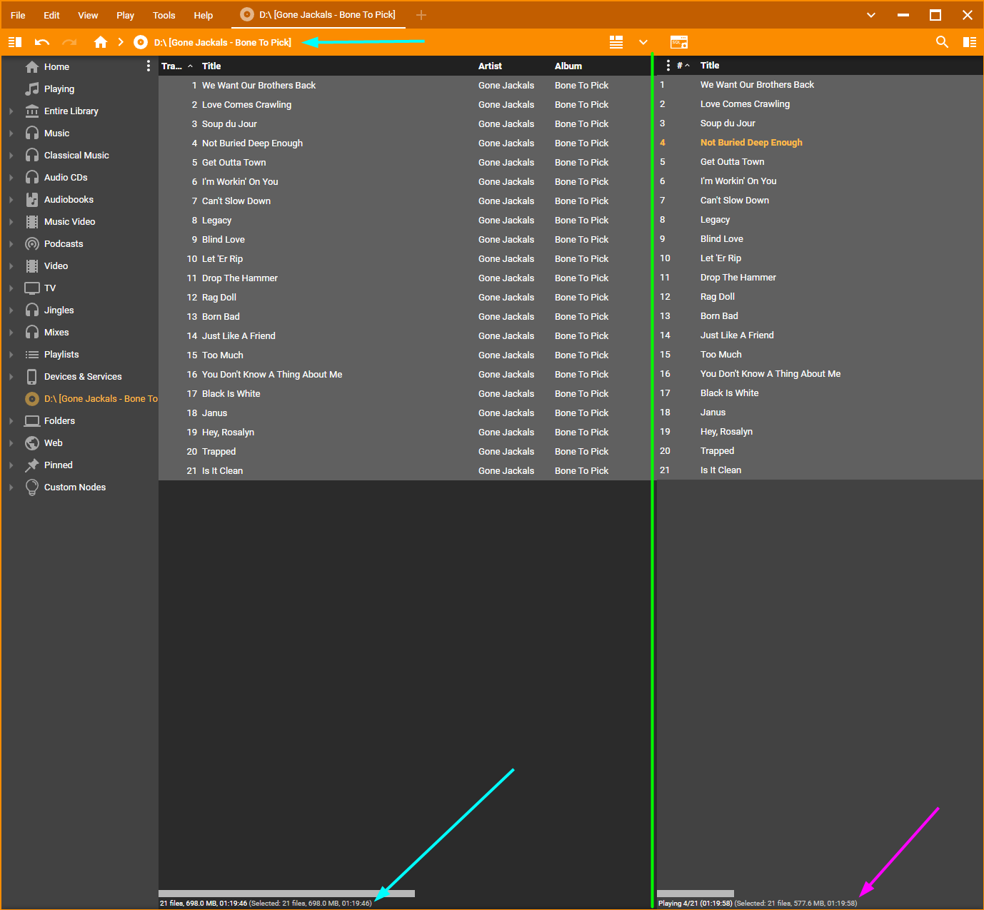 Left Side (Cyan) is selection of tracks from Burned CD Right side (Pink) is selection of files that are Burned to CD Total Time Difference is 12s eg. there is 12s of Audio missing on Burned CD. Source tracks are FLAC so Burn should be lossless eg. Burn FLAC to CD -> RIP CD into FLAC -> Audio Data from source and Ripped FLAC files should be Bit Perfect identical and there is 12s difference. |