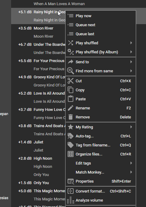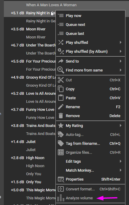 I tried clean 3221 build, scanned several albums, put one album to playing, renamed first track in Explorer, so it is not accessible, then tried in several views context menu on first track, or on more tracks with inaccessible track as first and in all cases Analyze volume is enabled. I still have no idea how to reproduce. |