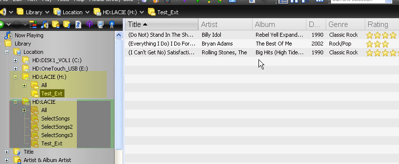 note from Bob: Figuring that there is an issue with how MM3 was handling the FAT32 drive, I converted it to NTFS. Good news in a way, this now confirms my hunch as I can now scan my test directory without any problems. Bad news, it doesn't recognize the drive as it was originally scanned. This does though kind of show why this may be occurring. Before a did a rescan of my drive MM3 was not showing any files in my test directory (Test_Ext) on my H drive (all titles were grayed out). Had me concerned until I then noticed that MM3 actually created a new location for the drive. You'll notice that the original drive is listed as "HD:Lacie" whereas the drive now converted to NTFS and rescanned shows as "HD:Lacie(H:)". Here is the location of the originally scanned drive - all songs are grayed out as MM3 doesn't recognize them: <missing image> Here is the "new" location - notice that the songs are not grayed out and listed once: <missing image> I noticed that MM2.5 does the same thing, it has created a new location as well - and the original location doesn't find the songs: <missing image> And here's the new location: <missing image> Hope this helps. Now that I've converted my drive I won't be able to verify any fixes but at least this should point you in the direction as to the root cause of the problem. |