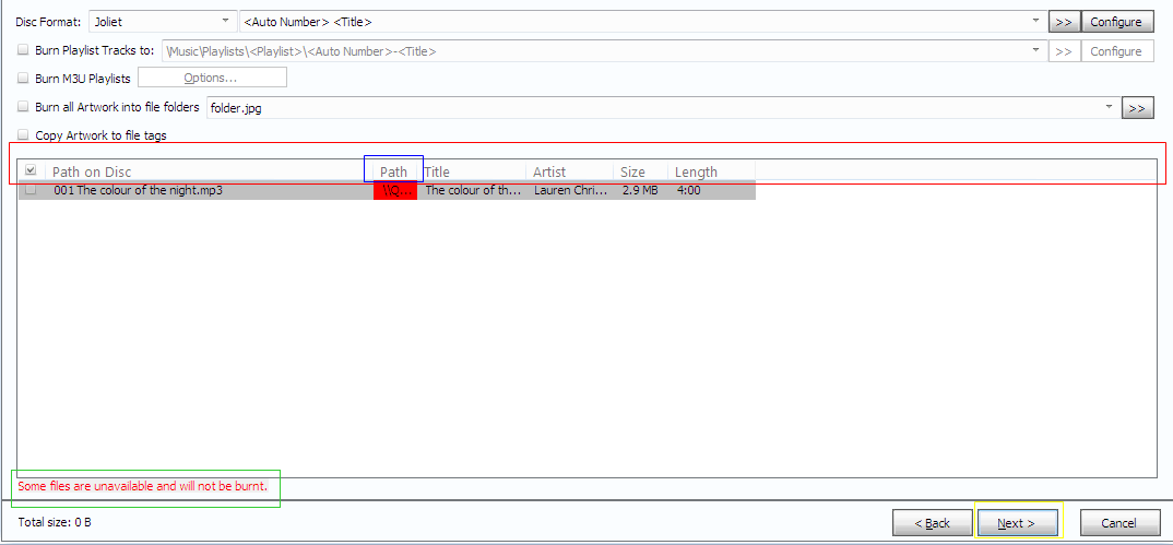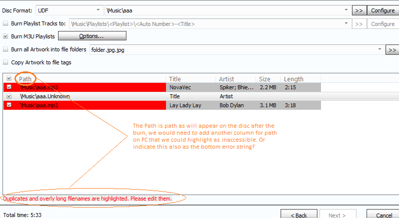 | Description | Currently, if some tracks cannot be accessed in relation to a burn, the burn proceeds for all accessible tracks and the following error results: 'Burn error: Selected tracks cannot be accessed!' This is misleading in cases where only some tracks are inaccessible. Possible fixes: a) A quick fix would be to display the following in those cases:: ----------------------------------------- | Burn Error: -------------------------------------------- | The following tracks cannot be accessed! -------------------------------------------- | Title | Artist | Filename | xxxx.xxx | xxxx.xxx |------------------------------------------- | . . . . . . . . [Back] [Burn] [Cancel] --------------------------------------------- note: burn would be greyed out if all tracks cannot be accessed b) A better fix suggested by Ludek is to automatically remove OR better yet to grey them out them directly on the Burn Wizard ("Choose Disc Format" Page for data CD and "Confirm audio CD tracks" for audio CD) and not after clicking burn to prevent burning only half of disc in case when half of tracks cannot be accessed. [I prefer the approach of greying them out because that's consistent with the way that MM works and it's clear to the user that such tracks are unavailable. | ||||