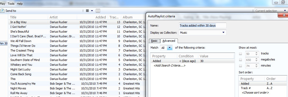| Description | Currently it's possible to sort by DateAdded in auto-playlists and advance searches. But since the field DateAdded contains time the sort-order in the result isn't always as expected. This feature has been requested many times. Since the current DateAdded already exist, but really is DateTimeAdded, some renaming of the fields needs to be done to avoid confusion. (Or can DayAdded be used instaed?) Perhaps also a YearAdded, MonthAdded and WeekAdded would make sense to implement? | ||||